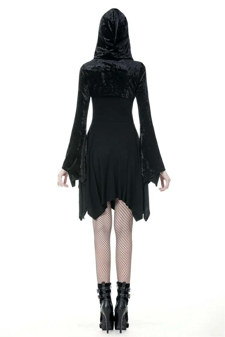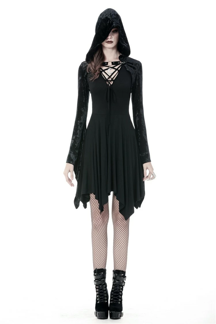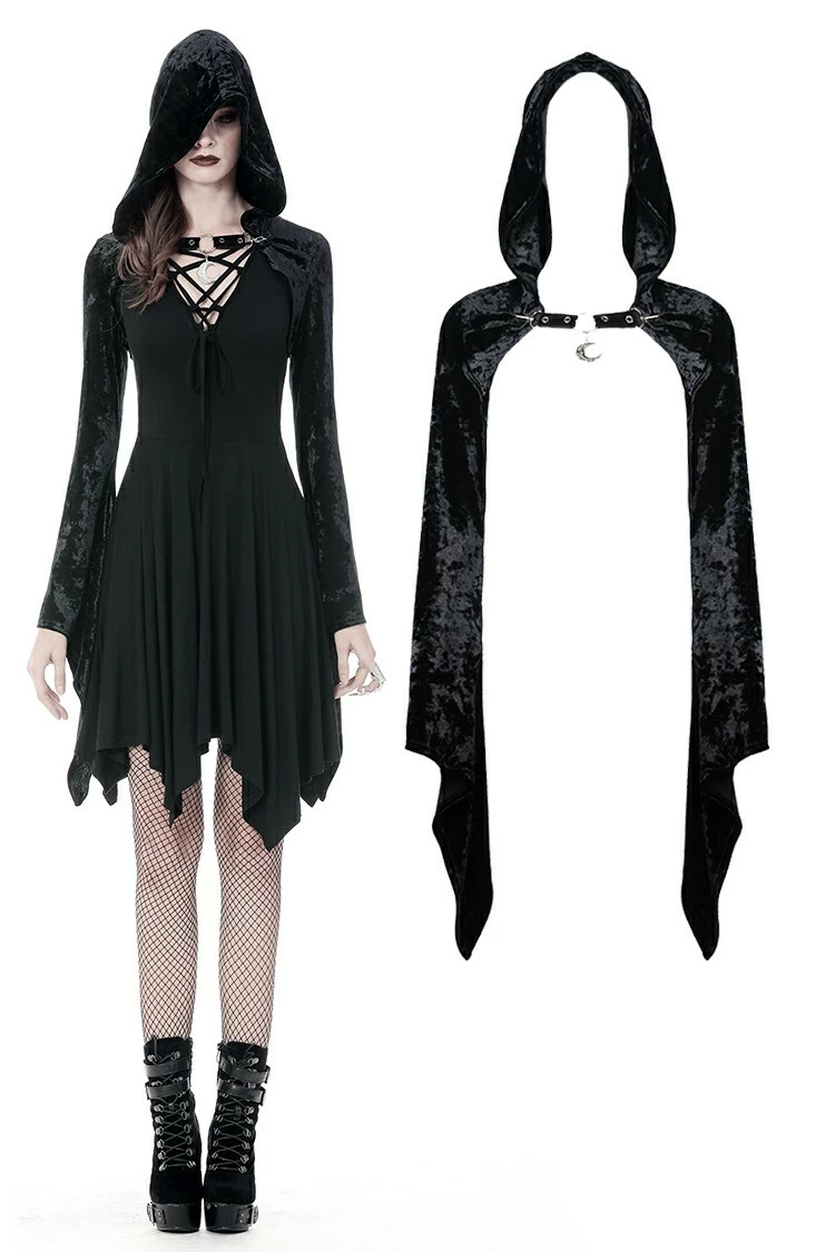 Petit boléro à capuche en velours noir corbeau aux reflets légèrement brillants