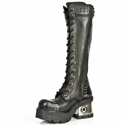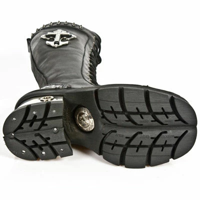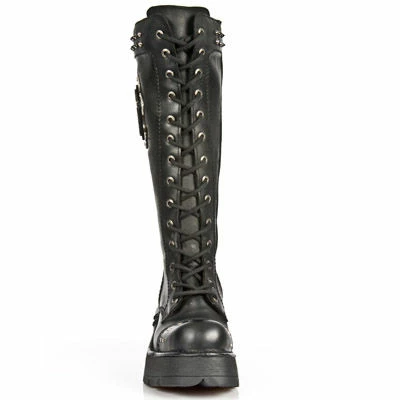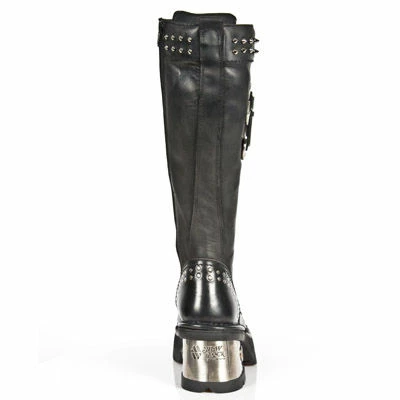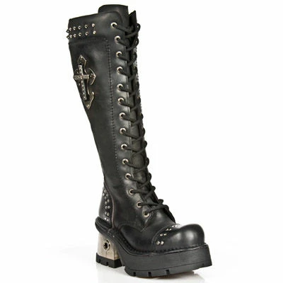 Du pur jus goth ! Ces grandes bottes en cuir noir New Rock ne passent pas inaperçues et pour cause, les talons en métal en jettent grave et les petits clous ainsi que la grande croix gothique ne sont pas là pour la discrétion