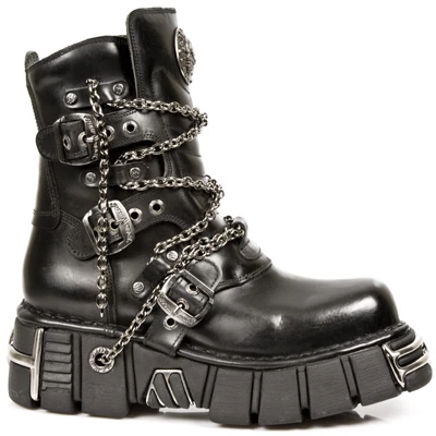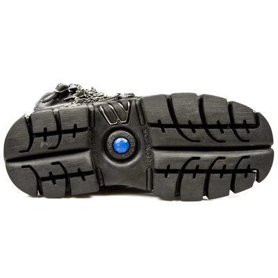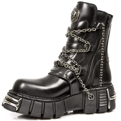 La new rock 1011 est ornée de chaines, 4 sangles de réglages, semelles tower avec inserts métalliques