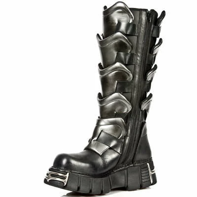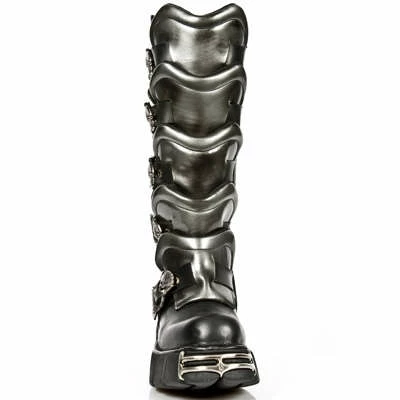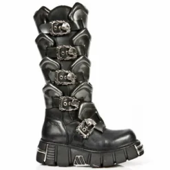Grandes bottes avec semelles compensées ‘tower’ de 5 cm, 5 sangles avec boucles métalliques « skull », tout l’esprit New rock dans ce modèle !