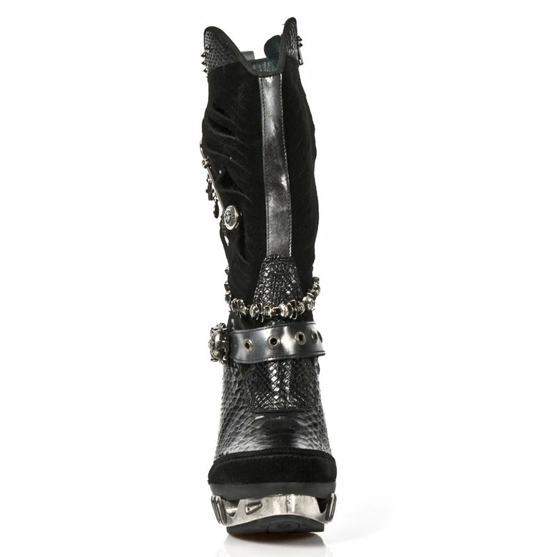 Grandes bottes en cuir noir bi-matiĂšre au style inimitable. Du talon en mĂ©tal fuselĂ© en forme de colonne vertĂ©brale Ă l’effet croco sur le devant et le haut de la botte, en passant par la chaĂźne de tĂȘtes de mort mĂ©talliques, la sangle ornĂ©e d’une boucle en forme de crĂąne, l’effet dĂ©chirĂ© et l’Ă©pingle Ă nourrice gĂ©ante sur le cĂŽtĂ© extĂ©rieur ; tous les Ă©lĂ©ments de cette chaussure rassemblĂ©s font son originalitĂ© et son style incomparable. La marque New Rock est la rĂ©fĂ©rence absolue pour toutes celles et ceux qui aiment les looks dĂ©calĂ©s et hors du commun, tant rock que goth, punk ou encore biker !