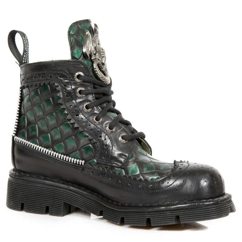 Le moins que l’on puisse dire c’est qu’elles en jettent non ? Ces bottines en cuir noir et vert sont agrĂ©mentĂ©es de deux gros dragons en mĂ©tal