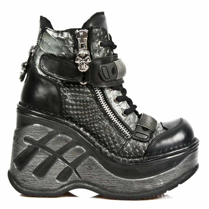 Superbes bottines en cuir noir et gris avec grosses semelles compensées de 5 cm et 12 cm au talon