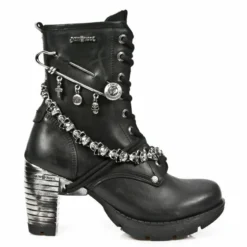 Cette paire de bottines en cuir noir de haute qualitĂ© est dĂ©corĂ©e d’une grande chaĂźne Ă tĂȘtes de mort et d’une Ă©norme Ă©pingle de nourrice, son talon mĂ©tallique spĂ©cifique lui donne un style trĂšs original
