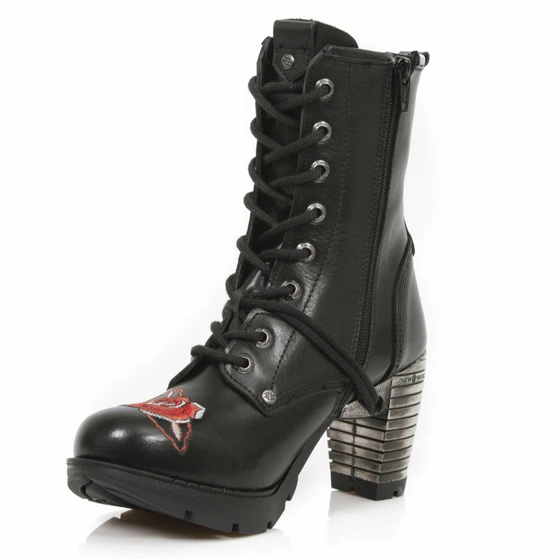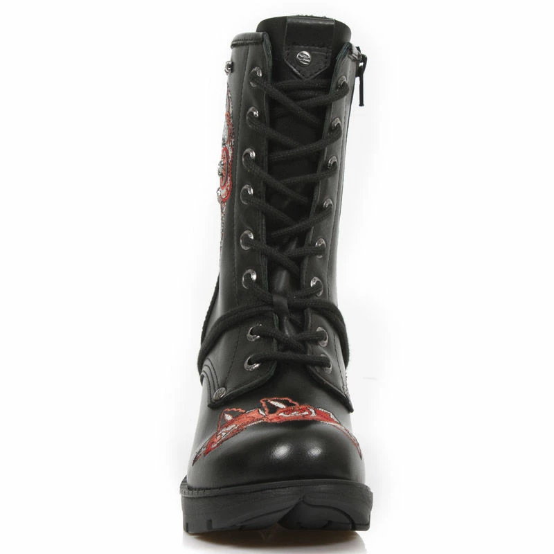 Magnifiques bottines New Rock en cuir noir avec motifs crâne mexicain et roses rouges cousus sur l’avant et le côté extérieur de la chaussure. On remarque d’ailleurs de petites têtes de mort en métal au niveau des yeux et du nez du crâne mexicain, qui ne sont pas sans rappeler ce talon métallique, emblématique de la marque New Rock. Ces bottines à lacets sont pratiques à enfiler grâce à une fermeture éclair présente sur le côté intérieur.