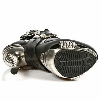 Les talons de 12 cm et les semelles de ces bottines sont de toute beauté, les boucles « skulls » et l’ajout de petits rivets métalliques accentuent encore le côté exclusif de ce modèle.