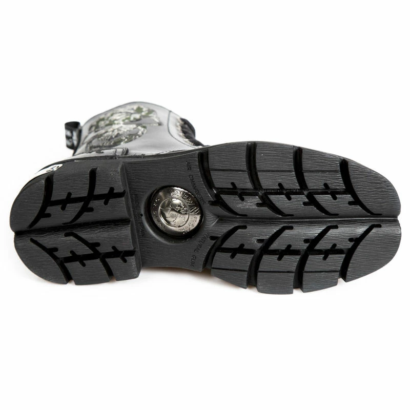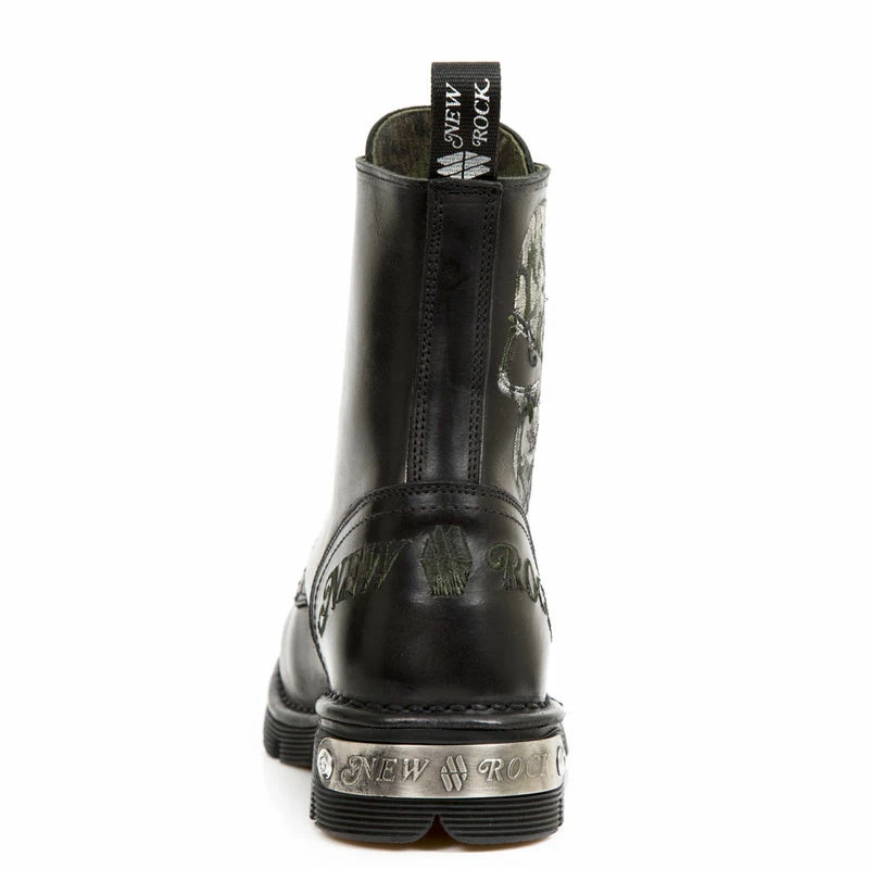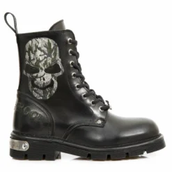 Bottines style rangers avec une tĂȘte de mort sur le cotĂ© de couleur kaki, vous trouverez aussi un marquage de couleur kaki sur l’arriĂ©re de la bottine, l’intĂ©rieur de la chaussure est de style camouflage, fermeture sur l’avant avec un lacet qui a pour dĂ©co sur le bas du laçage une plaque lame de rasoir, qualitĂ©, look, confort voilĂ les mots qui viennent en premier quand on parle de new-rock, sur le haut de la semelle vous trouverez une plaque en mĂ©tal, bottines mixtes  Â