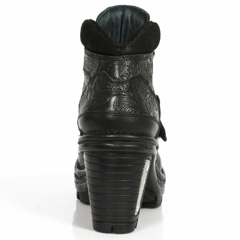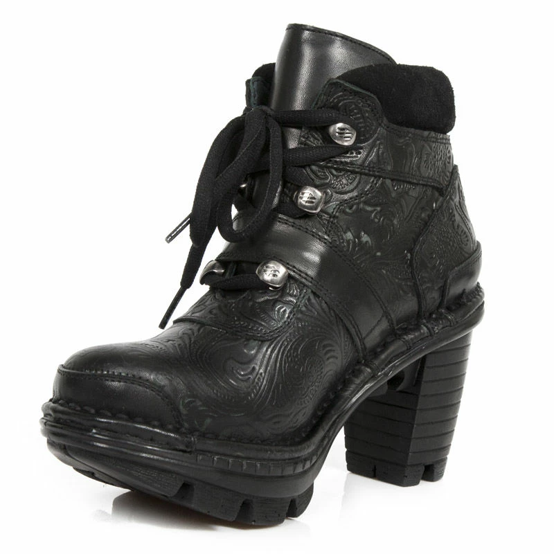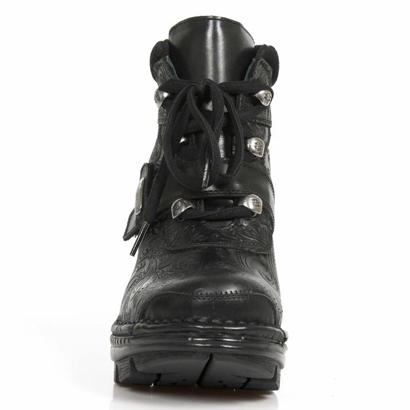 Magnifiques bottines style low boots en cuir noir à motifs fleuris, effet baroque garanti. Elles sont ornées d’une sangle en cuir lisse noir et de lacets, avec quelques petites touches de métal, symbole de la marque. On retrouve cette touche métallique sur la plaque fixée sur le flan du talon. Le tour de la cheville en daim noir ajoute une touche d’originalité supplémentaire à cette chaussure unique.