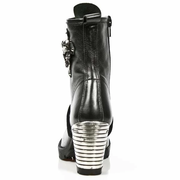 Bottines femme en cuir avec fermeture éclair sur le coté et laçage sur le devant de la bottine , décoré d’une croix et quatre rivets aux extrémités de celle-ci , sur cette croix vous trouverez une tête de mort avec le logo New-Rock, talon métallique qui donne un coté goth rock à ce modèle, vous pourrez les porter en jupe ou en pantalon, en journée ou en soirée .