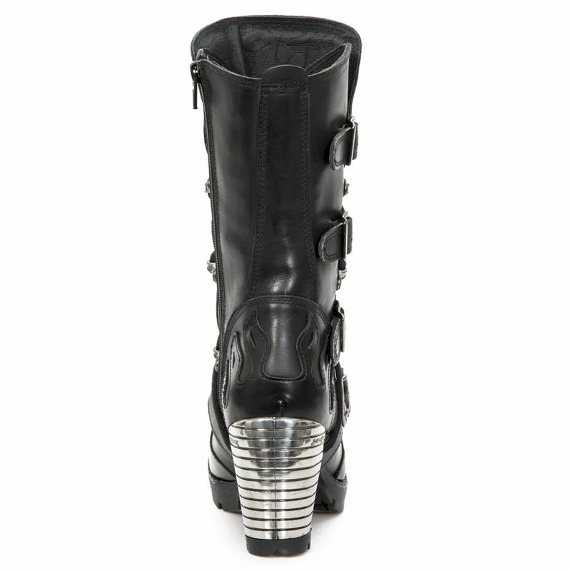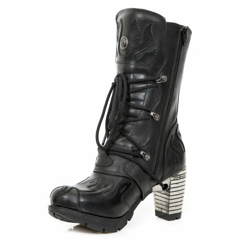 Bottines gothique en cuir noir de chez New Rock avec quatre boucles de dĂ©coration sur le cĂŽtĂ© extĂ©rieur de la botte, vous pouvez aussi retrouver le fameux talon en mĂ©tal spĂ©cifique au modĂšle New Rock, des flammes en surpiqĂ»re viennent dĂ©corer la bottine sur l’avant l’arriĂšre et le haut, vous ne passerez pas inaperçu ! alors laissez vous tenter, elles sont faites pour vous !