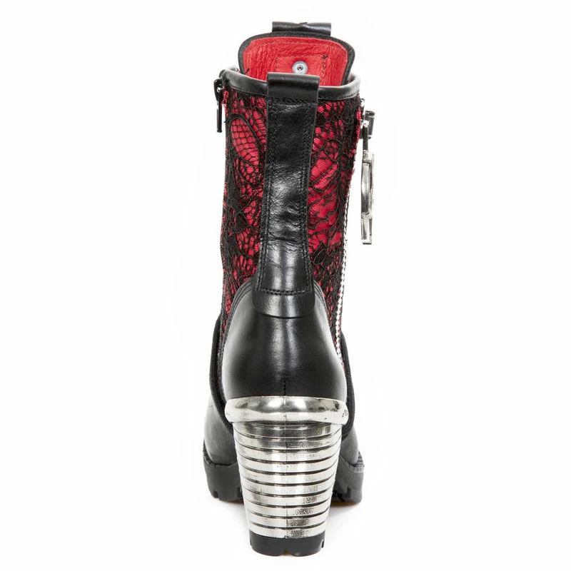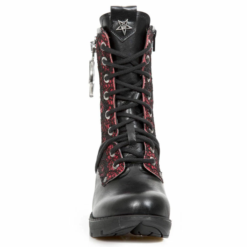 Mélange de dentelle et de cuir pour cette bottine gothique black and red, un modÚle original et féminin, on retrouve un talon en acier et une fermeture éclair de décoration avec un gros pentacle en guise de tirette mais vous avez également une vrai fermeture éclair pour un enfilage facile. Ce modÚle de chez New Rock pourra se marier avec vos tenues gothiques et rock à votre guise.
