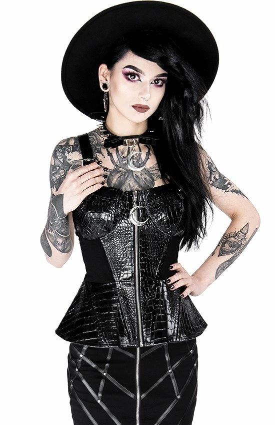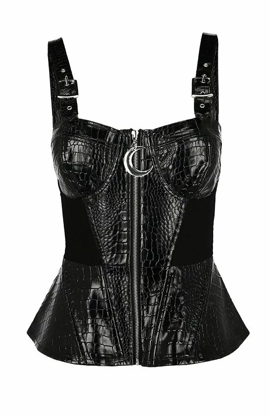 Ce bustier signĂ© Restyle est composĂ© d’une partie en simili cuir look alligator et d’une partie en tissu