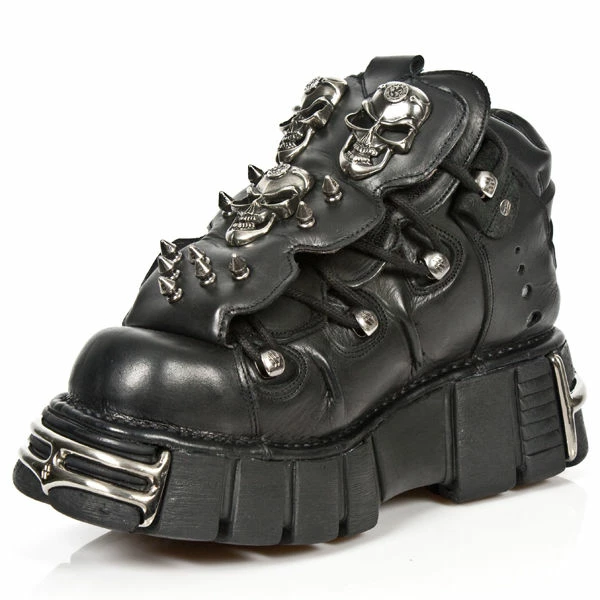 Chaussures unisexe en cuir noir à semelles compensées, elles sont décorées de gros skulls sur la languette pour un look d’enfer