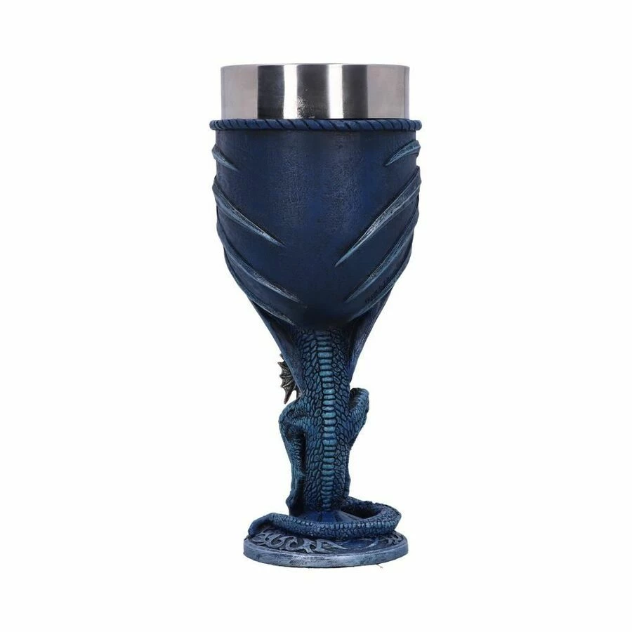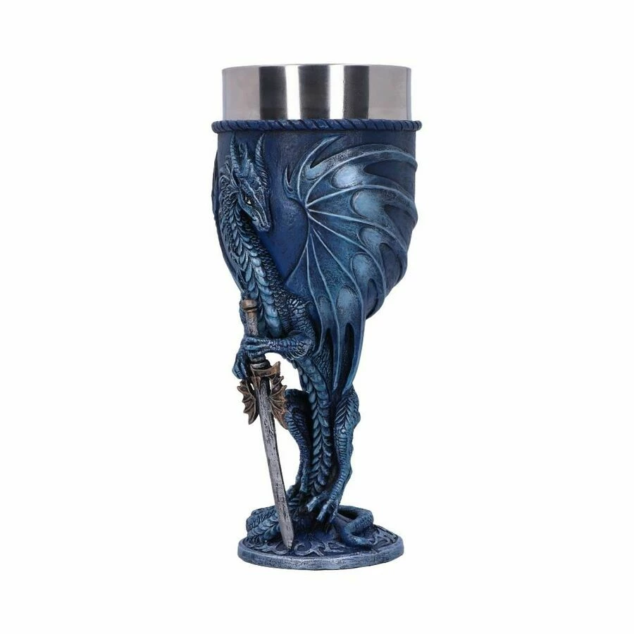 Autour du gobelet bleu marine se trouve un dragon bleu foncé qui tient une grande épée avec les deux griffes alors que la lame est maintenue au sol.