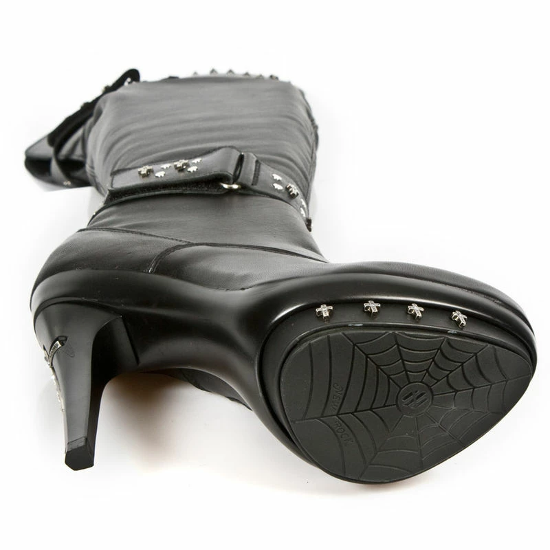 All black pour ce modèle de cuissardes cuir de chez New Rock, le cuir, les semelles, les talons, seuls les clous et la croix gothique ne le sont pas et du coup ils contarstent à merveilles avec les bottes