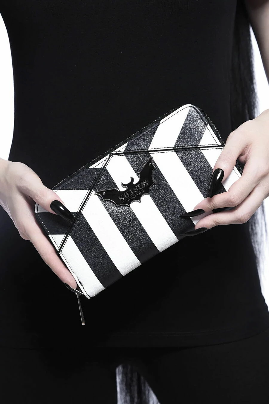 Le portefeuille « Never Trust The Living » est dotĂ© d’un corps en similicuir premium ornĂ© d’un imprimĂ© Ă rayures, d’une plaque de chauve-souris de la marque