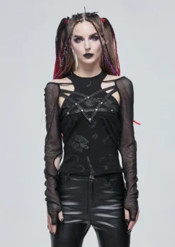 Il possède des manches en tissu résille à grosses mailles (tissu filet) avec une découpe au niveau des coudes et le passage pour le pouce et l’index