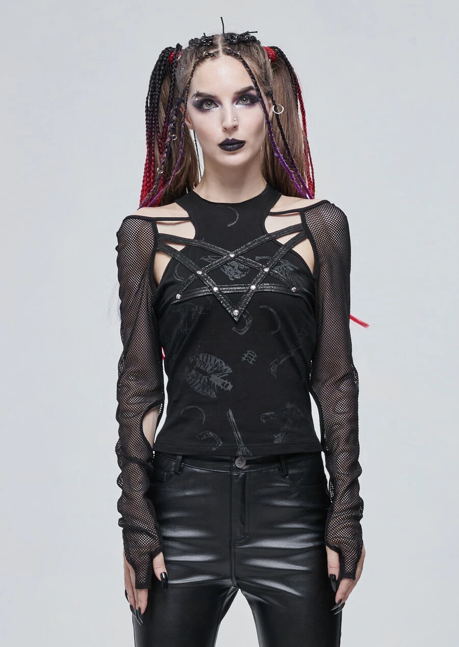 Il est agrémenté d’un grand pentagramme fait de bandes de simili cuir vieilli avec des rivets de décoration