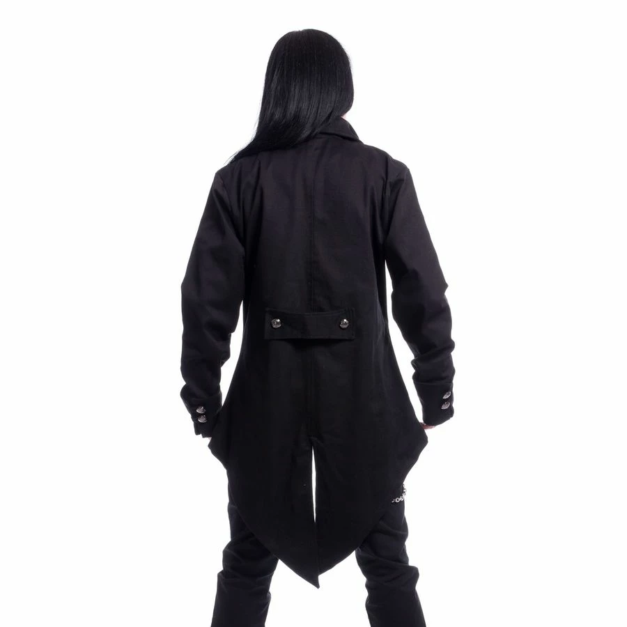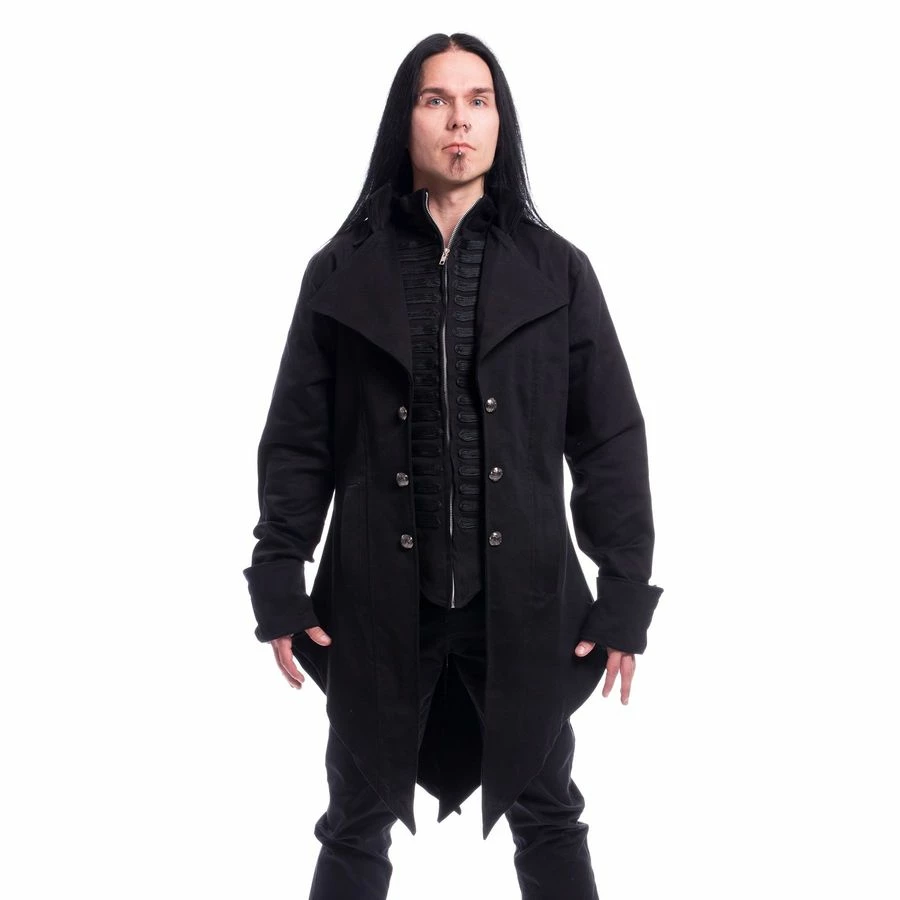 Un manteau goth 3/4 de grande classe, il a un effet 2 en 1 donnant l’impression de 2 vestes superposées, sa coupe en pointe lui apporte un style bien original