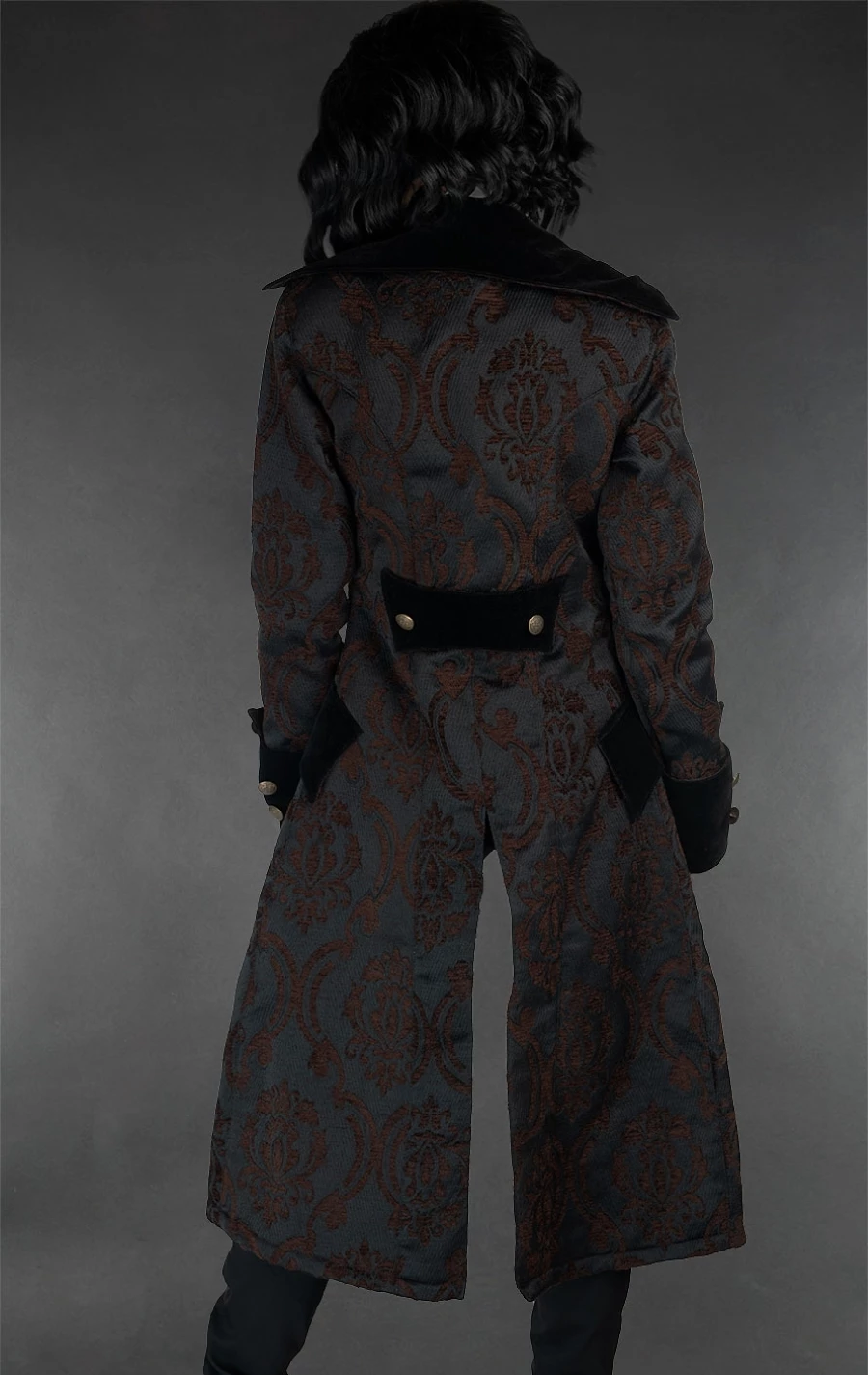 TrÚs beau manteau victorien de style pirate taillé dans un tissu jacquard noir décoré de motifs baroques marrons