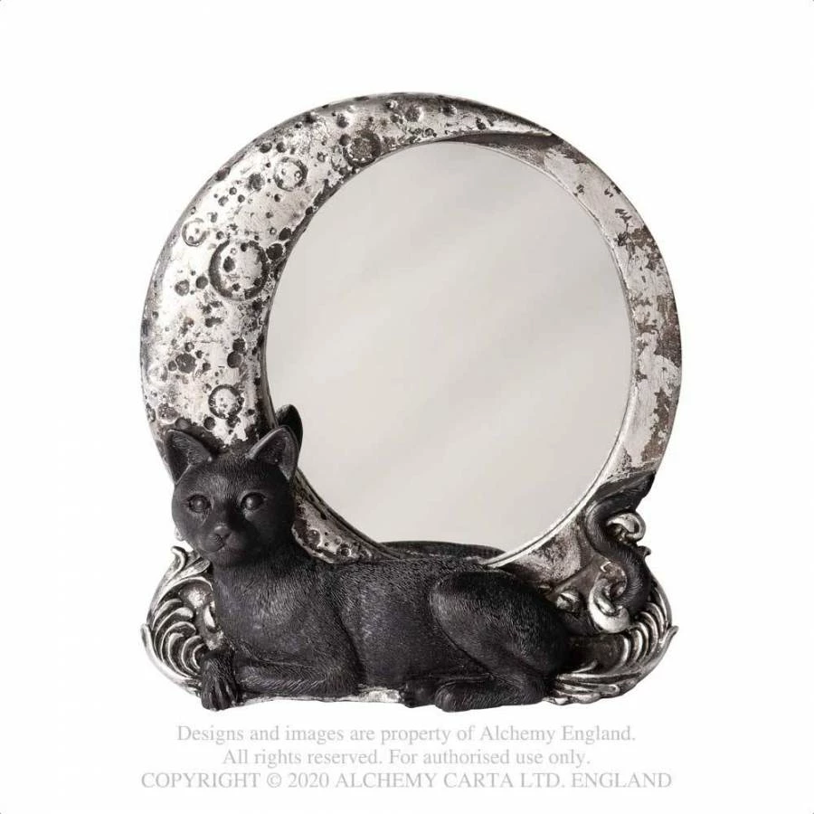 Miroir sur le thÚme du chat noir et de la lune. Fini à la main en résine poly de haute qualité à effet argent antique