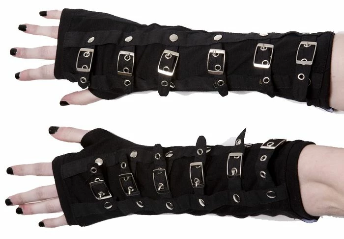 Ces mitaines gothiques en coton noir corbeau sont décorées de nombreuses sangles et rivets métalliques
