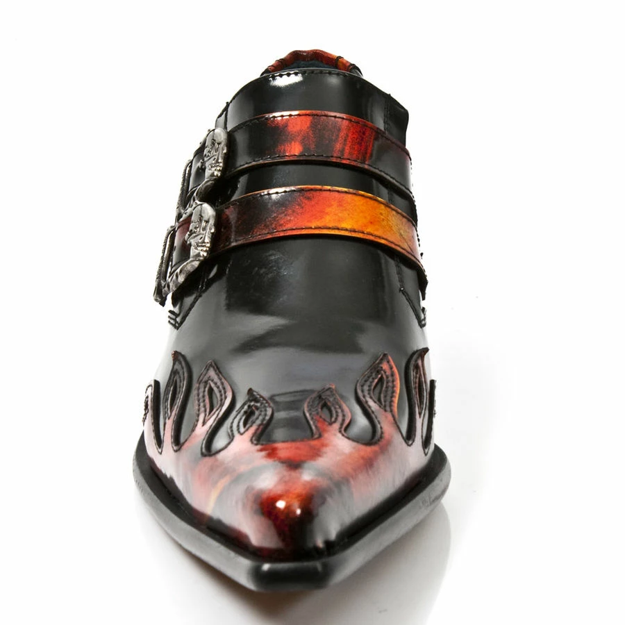 Le fameux flammé rouge cher à New Rock, les boucles métalliques ‘skull’, un talon métal…la classe avec la touche new rock en plus !