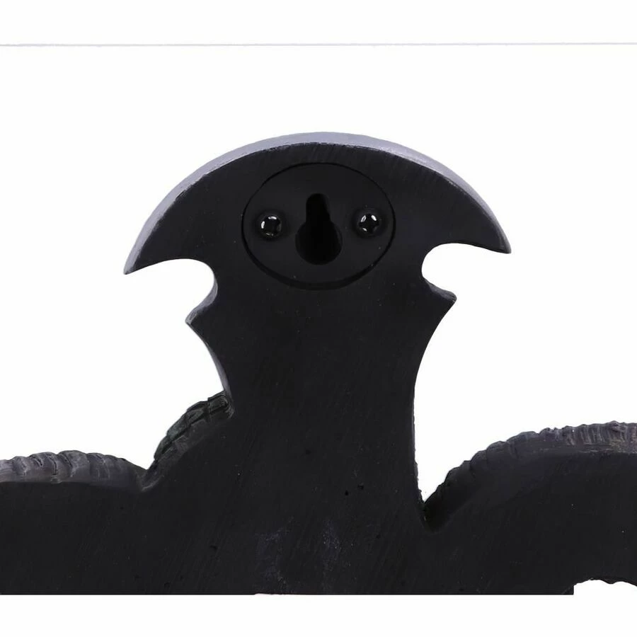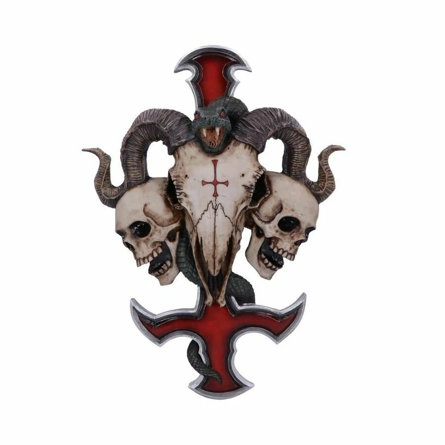 Cette plaque murale savamment exécutée avec la croix du diable immortalisée dans la résine, avec un serpent émeraude et un crùne de bélier flanqué de deux crùnes humains, suspendus sur une croix de pétrine, cette piÚce est coulée en polyrésine de haute qualité et peinte à la main de maniÚre experte