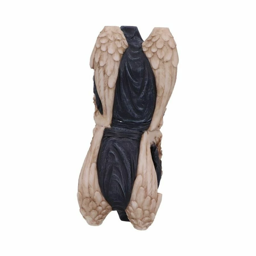 Une capuche noire couvre son visage alors que ses grandes ailes tombent de l’autre côté de la minuterie, rencontrant une autre faucheuse, reflétant celle ci-dessus