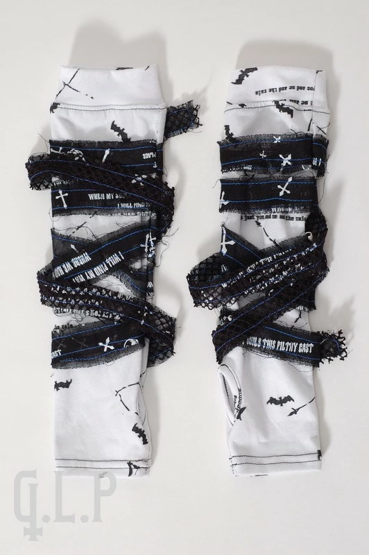 Longues mitaines gothiques en coton dĂ©corĂ©es d’Ă©pingles de nourrice et de piĂšces de tissu effet vieilli, passage pour le pouce.