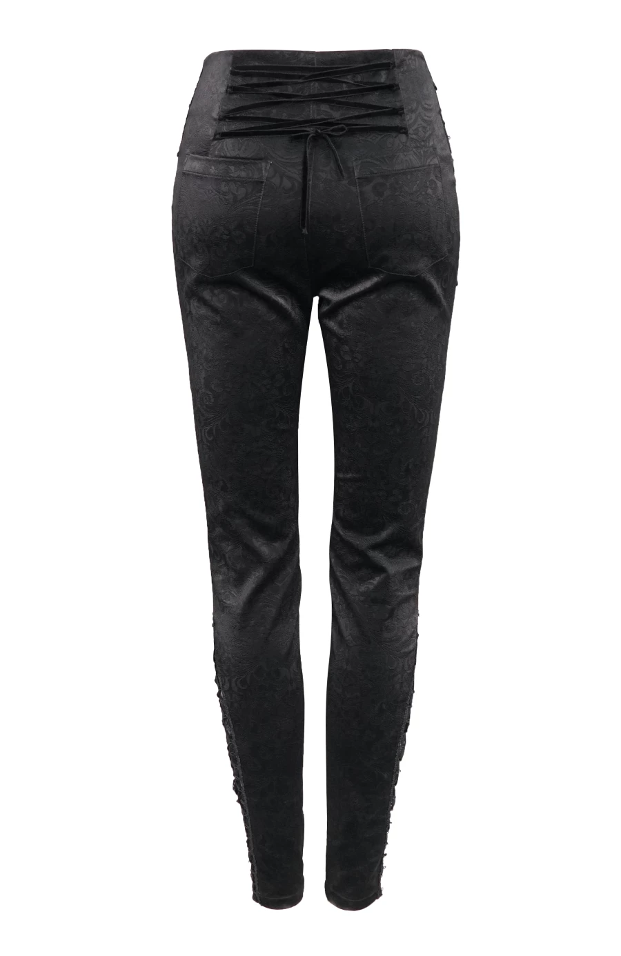 Le bas des jambes est Ă©galement agrĂ©mentĂ© d’empiĂšcement laissant apparaĂźtre une dentelle noire cette fois avec lacets de velours et broderies