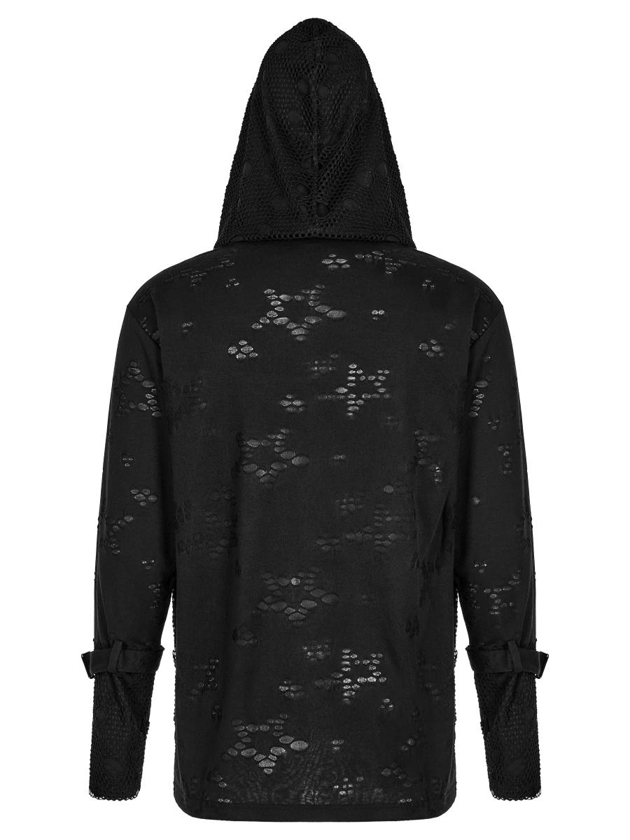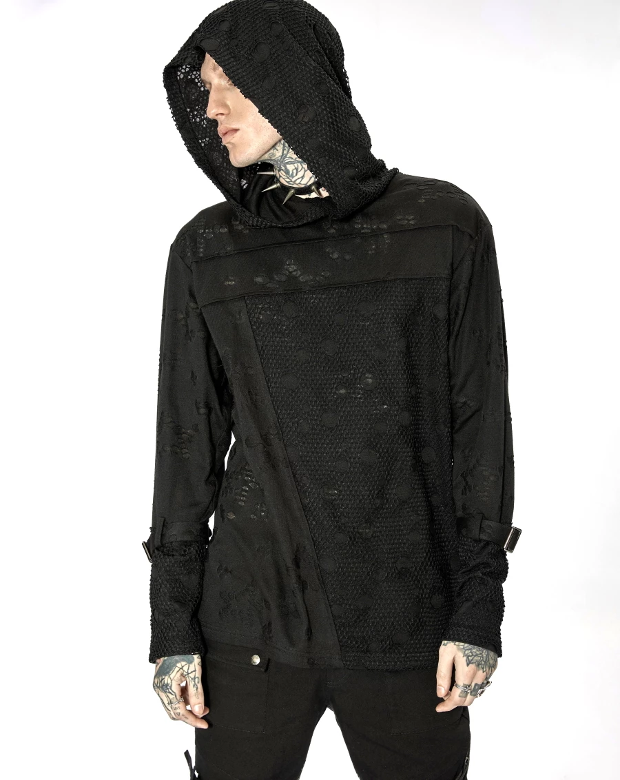 Il est agrémenté de nombreux effets troués et de tissu filet dans un pur style destroy