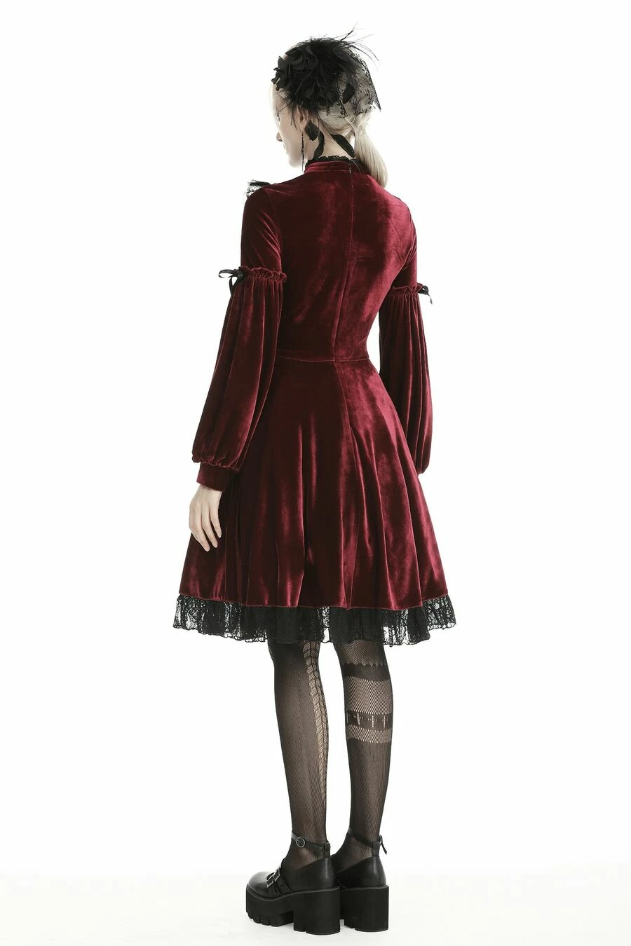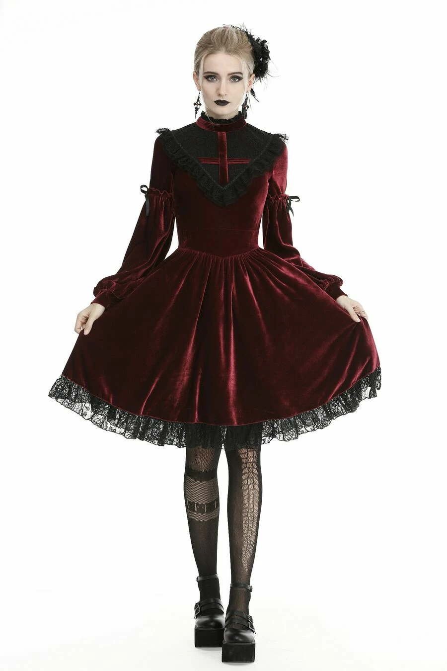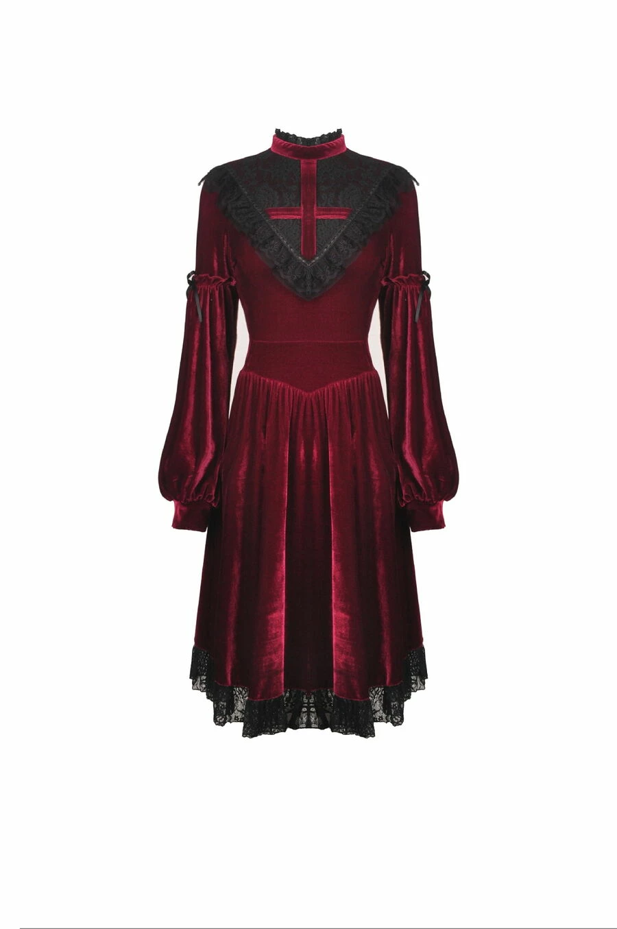 Elle est agrĂ©mentĂ©e d’une partie haute en V en fine dentelle noire avec une grande croix gothique en velours