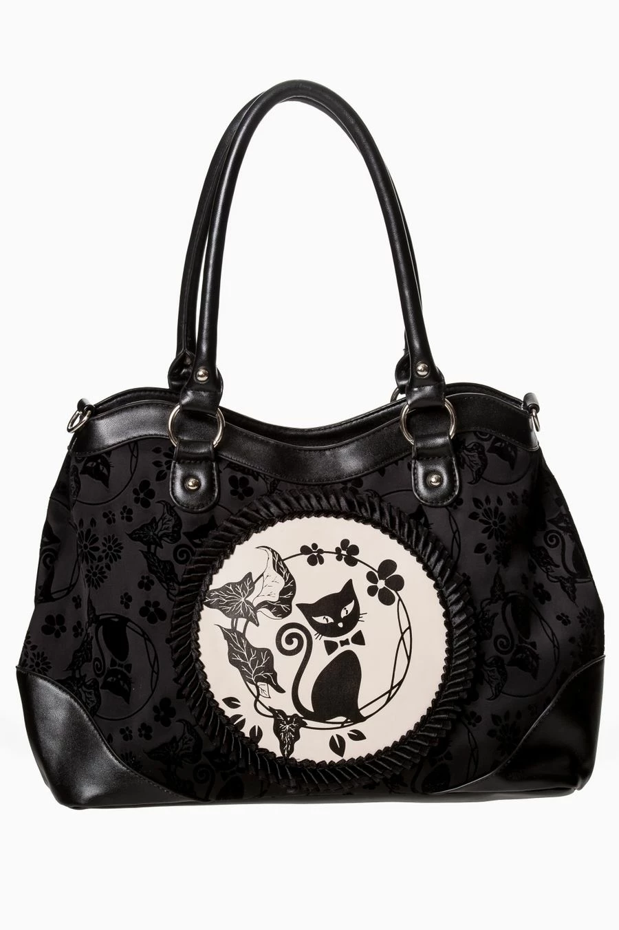 Son tissu est floqué de nombreux chats noirs en velours ton sur ton