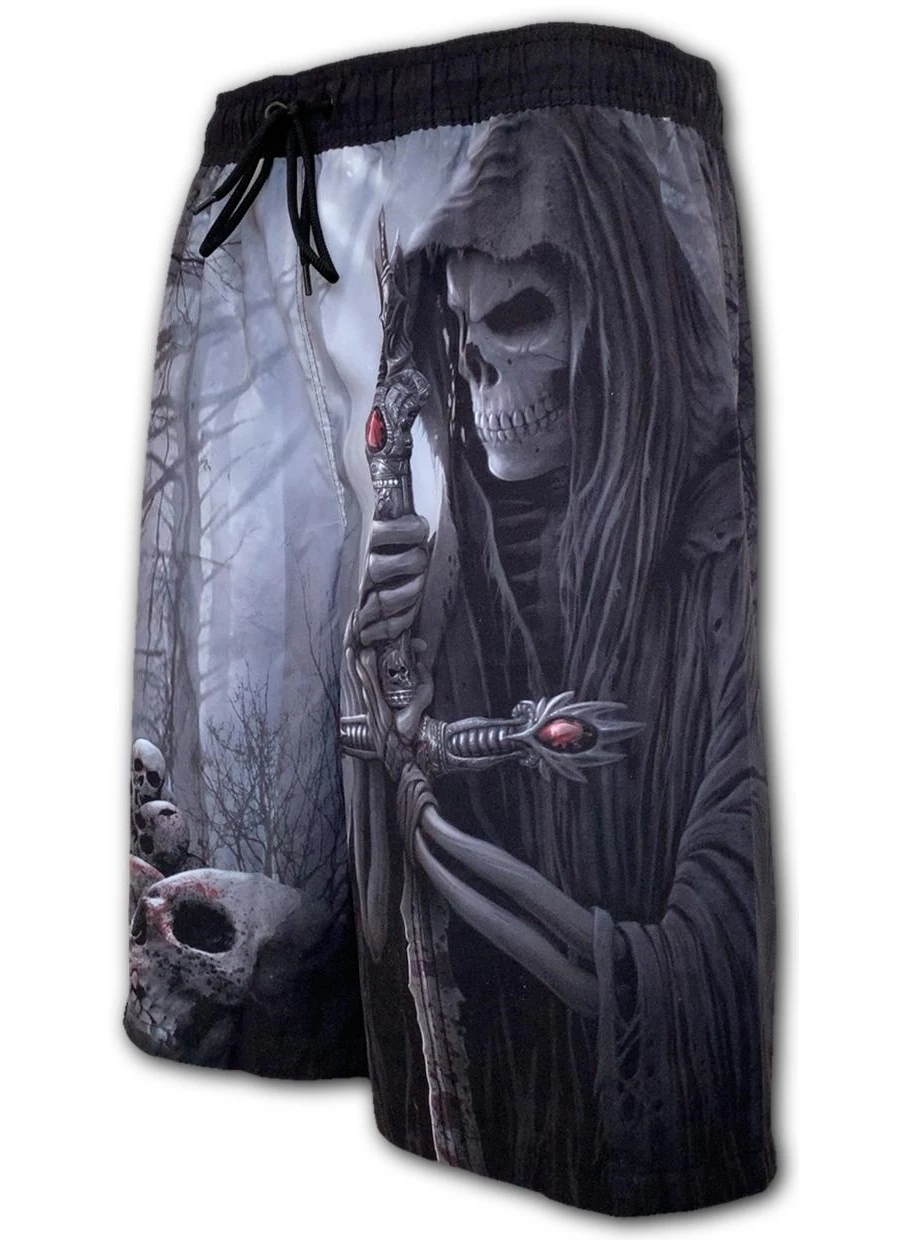 ImprimĂ© all over avec le fameux reaper tenant son Ă©pĂ©e de la mort sur une jambe et le sol jonchĂ© de crĂąnes humais sur l’autre jambe