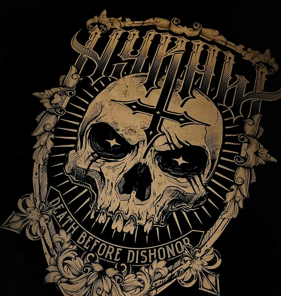 L’imprimĂ© reprĂ©sente un Ă©norme skull terrifiant avec inscription « death before dishonor’ (la mort avant le dĂ©shonneur)