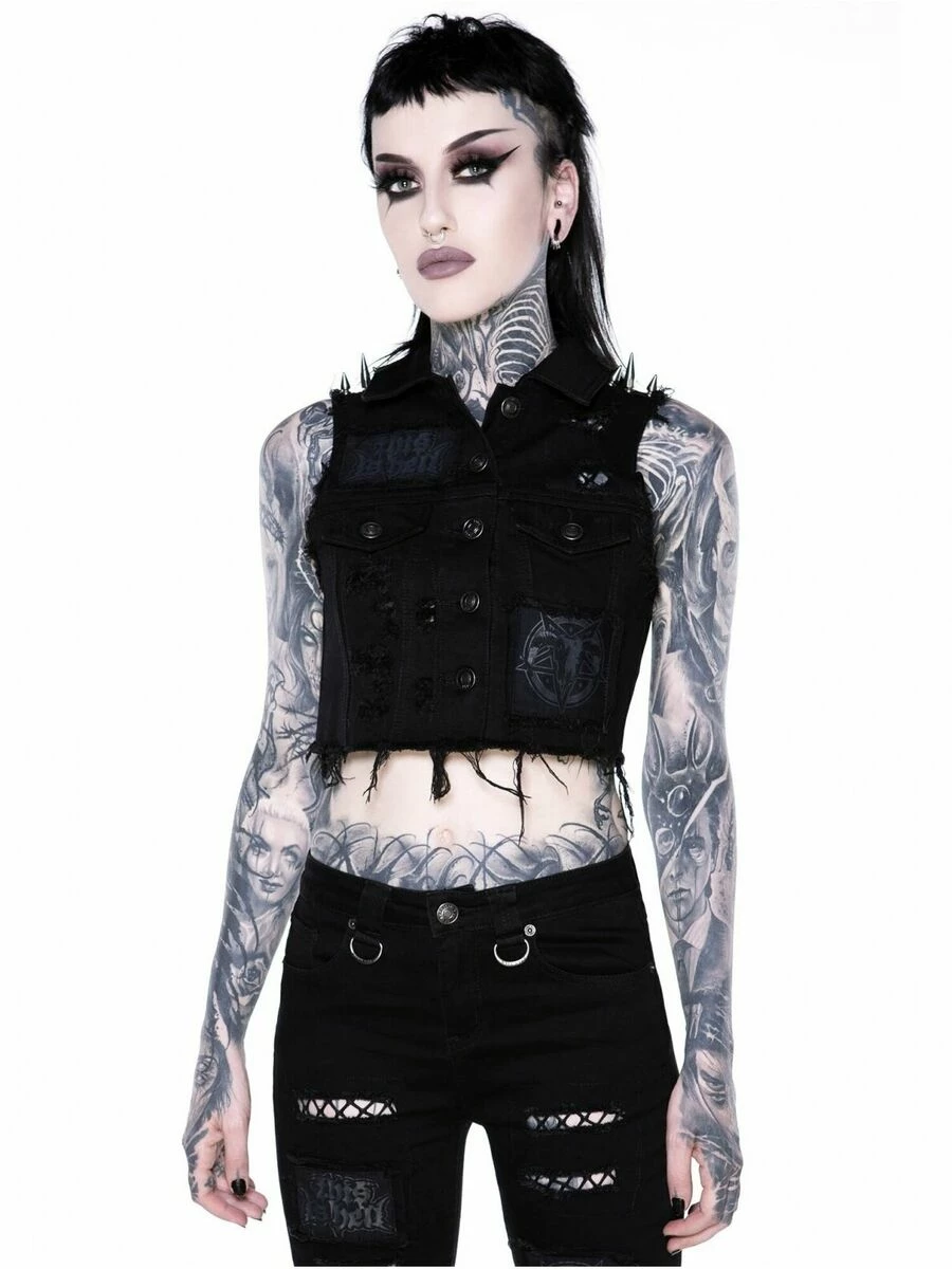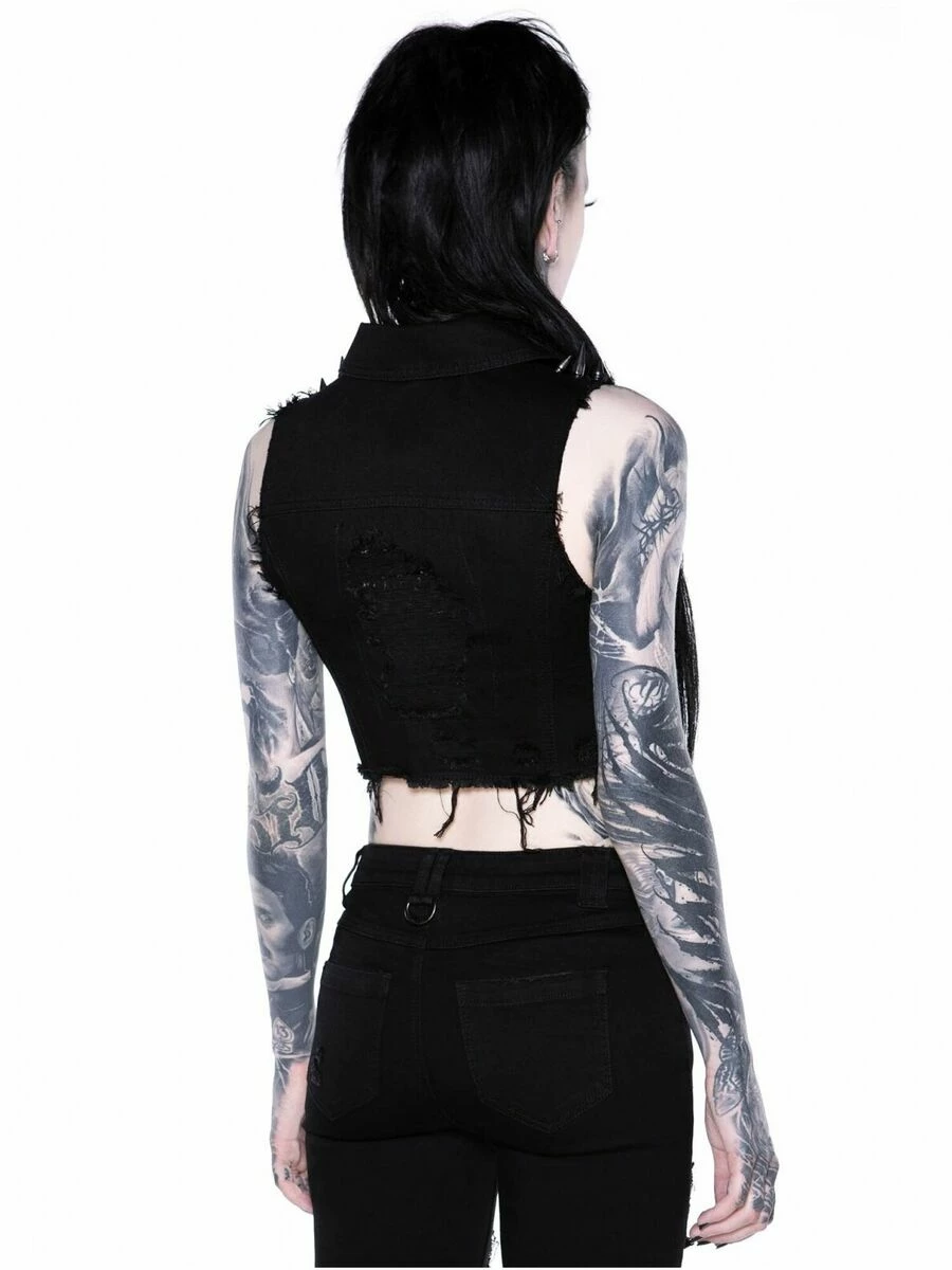 Terrible veste sans manches en jean taillée dans un tissu denim vintage de qualité par Killstar