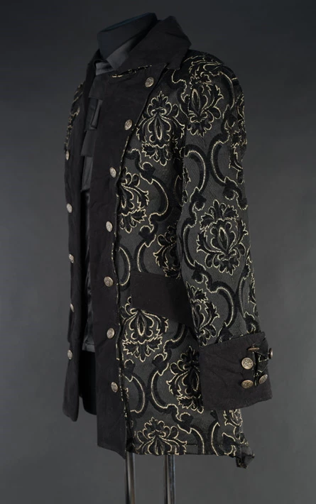 Belle veste victorienne de style pirate? taillée dans un tissu jacquard noir aux motifs baroques couleur or